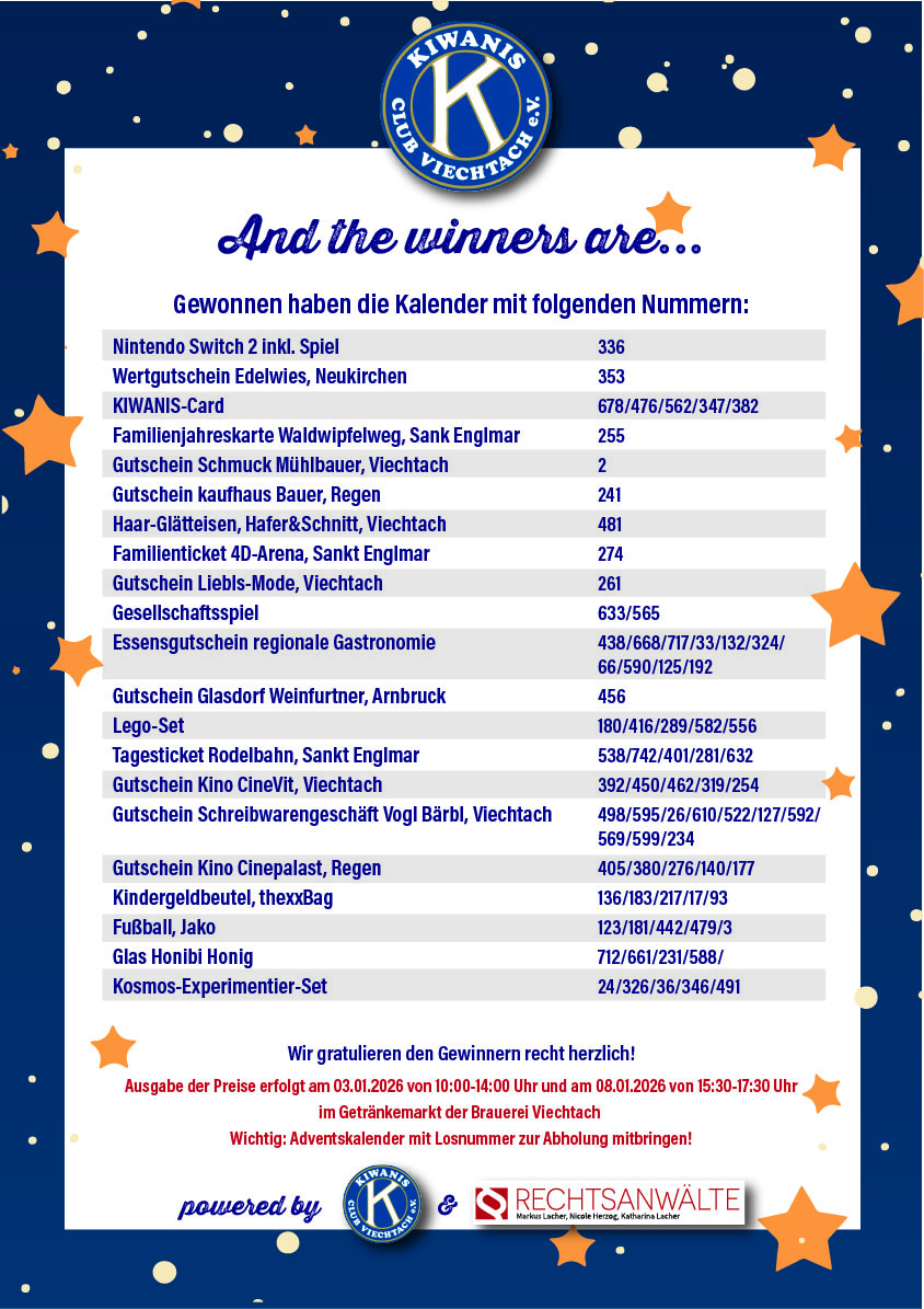 Der Kiwanis Club Viechtach startete erstmals den Benefiz- Adventskalender „Wünsch dir was“. 750 Exemplare wurden zum Preis von 10 € verkauft, der Erlös ging vollständig an Kinderheime im Landkreis Regen (Marienheim Regen, Vinzenzhof Bischofsmais).